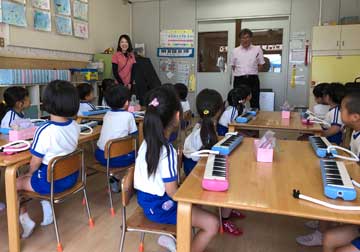 蔭山先生のお話を聞いて、指使いを確認しながら鍵盤ハーモニカを真剣に弾いています♪