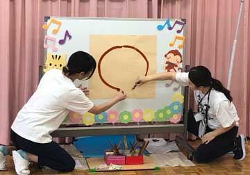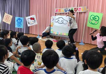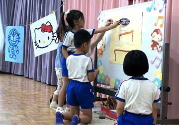 続いてドラえもん、キティちゃんと…、先生たちの絵描き歌で、みんなが知っている