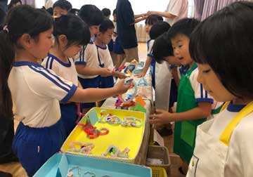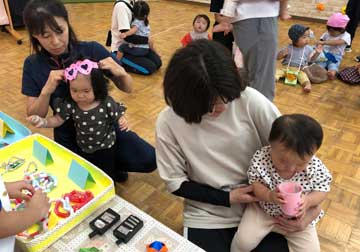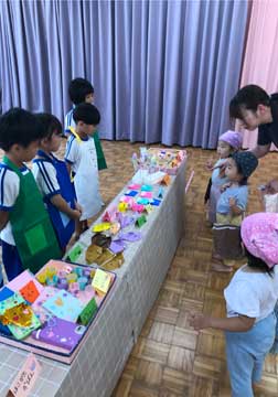 お店に並んだ手作りおもちゃを見て「どれにしようかなぁ~」と迷ったり、気に入った物をみつけ「これ下さい!」とお店屋さんとやりとりをしたり、みんなでお店屋さんごっこを楽しんでいます♪