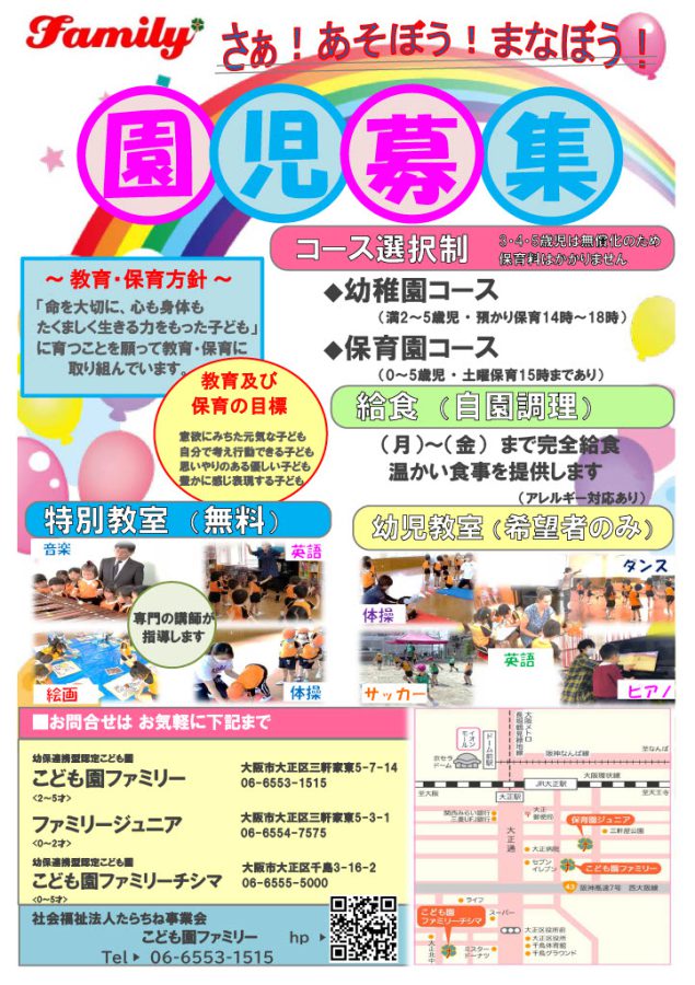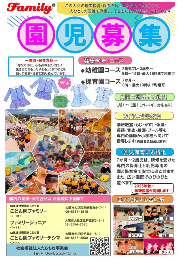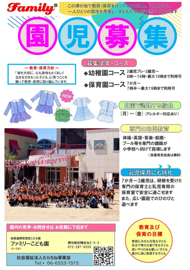 ご不明点は、こども園ファミリー(06-6553-1515)まで