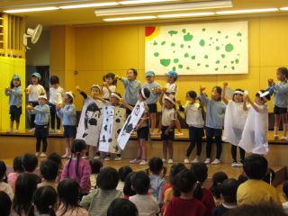 つきぐみさんは5月に歌った「はたけのポルカ」から、みんなの育てたお野菜を食べようとする動物さんを捕まえて、一緒に踊りました