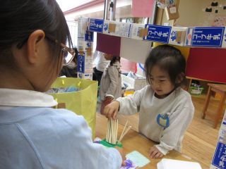 廃材をたくさん集めていた年中さん 各クラスでお店屋さんがオープンしました