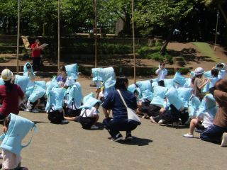 雨がやんだ朝一番、いいじまっこが幼稚園にやってきました。