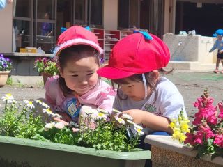 今は八重桜が満開です。幼稚園に慣れてきて、春の遊びを楽しんでいます。