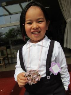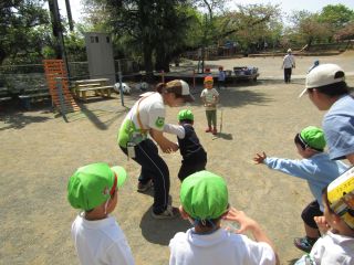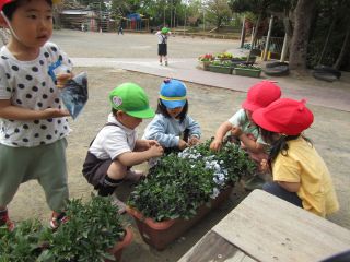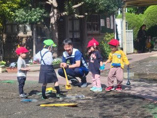 今は八重桜が満開です。幼稚園に慣れてきて、春の遊びを楽しんでいます。