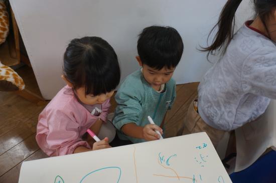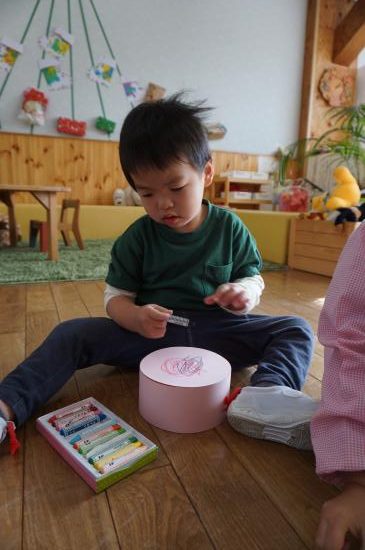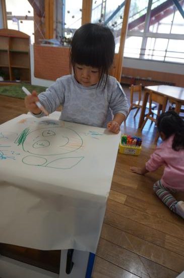 小さいクラスでは、珍しい機会でもあるので作品の展示に使った土台にそのままお絵描きをしたり…。