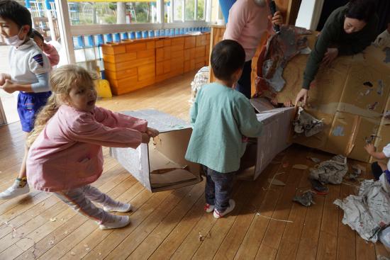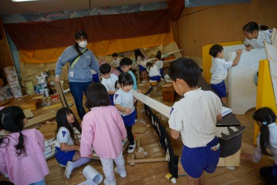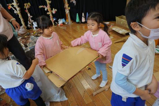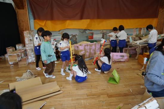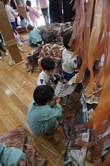 そしていよいよ、ホールの『ぼくたち・わたしたちしか知らないヒミツの世界』での遊びもスタートしました。子ども達から始まった小さな活動が、園全体を巻き込む大きな流れとなりその集大成としての『あそび』へと…。