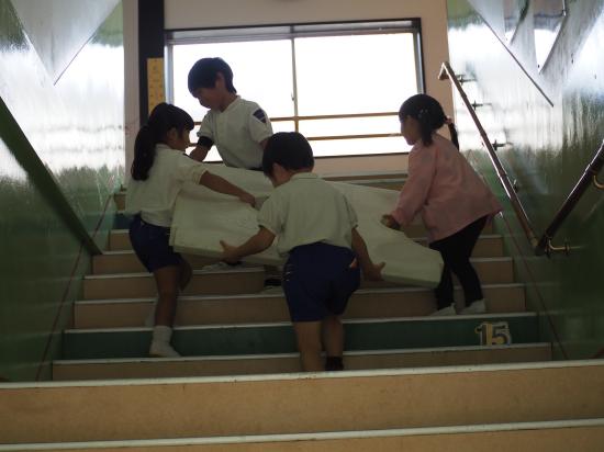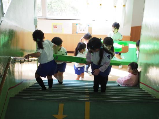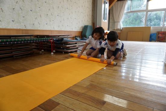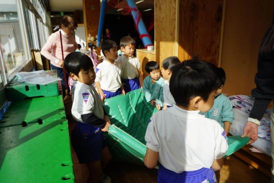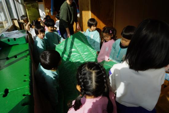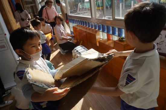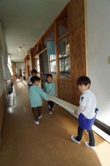 『水道が使えないね』『カバン置くところどうしようか…』等など、生活の中にあるちょっとした『不便』を楽しさの中にも感じ始めた子ども達。ホールがこのままだと、体操やこれから訪れる『クリスマス会』も出来ないし…。