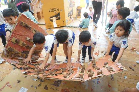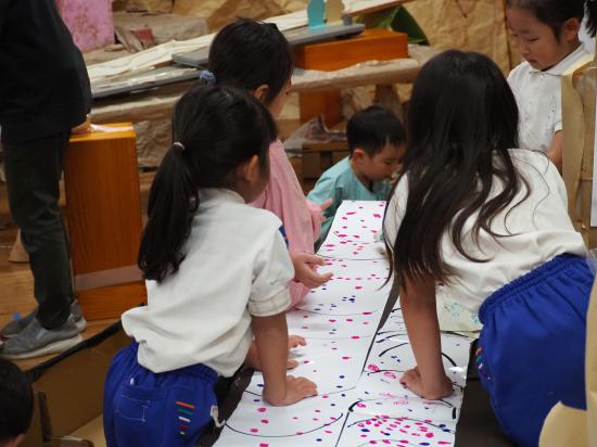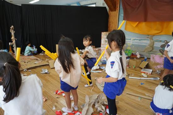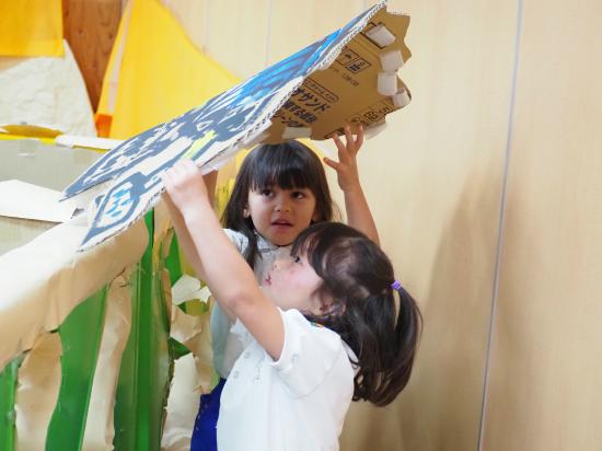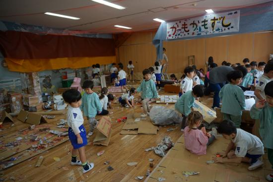 かもいようちえんの作品展は、子ども達が作り上げ、子ども達が最後までかかわる行事です。『最後まで』とは出来上がった作品展を自分たちで見学し、遊びにし、片付けまで取り組んでいくことを表しています。