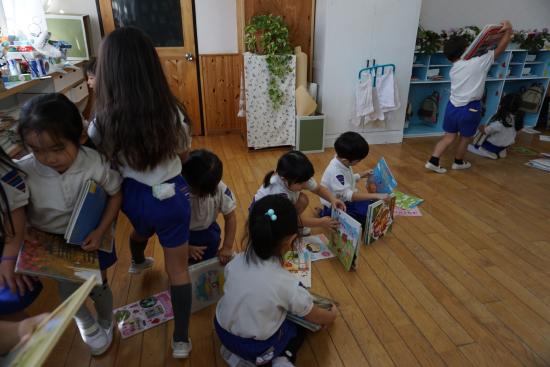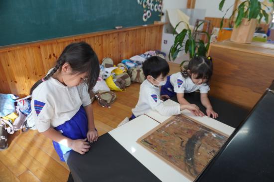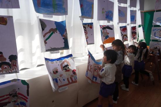 自分のクラスの作品はもちろんのこと、お兄さんお姉さんのクラスや、小さなお友達のお部屋を自由に見学したり、クラスの友達や先生と見学したり…。