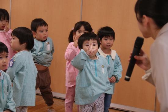 年中組は●体を作るもとになる(主菜)、●熱や力のもとになる(主食)、●体の調子を整える(副菜)の3つの役割の食べ物を『元気の出る歌』で教えてもらいました。その後、『新幹線 げんき号』が登場し、食べ物がどの役割なのかを3色の車両に分けていくゲームをしました。お友だちが箱から出した食べ物を「あか!」「みどり!」とみんな元気な声で答えていました(^^)