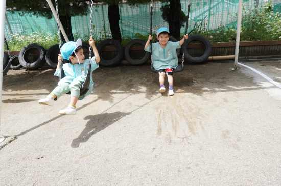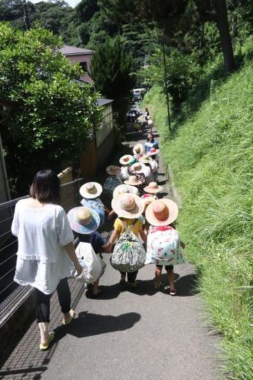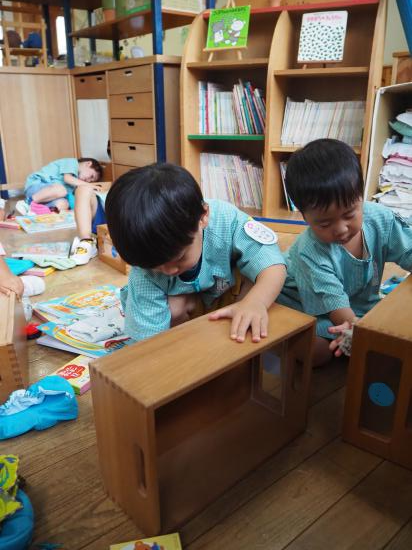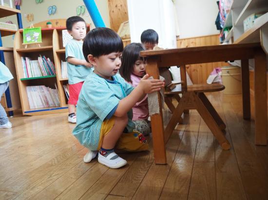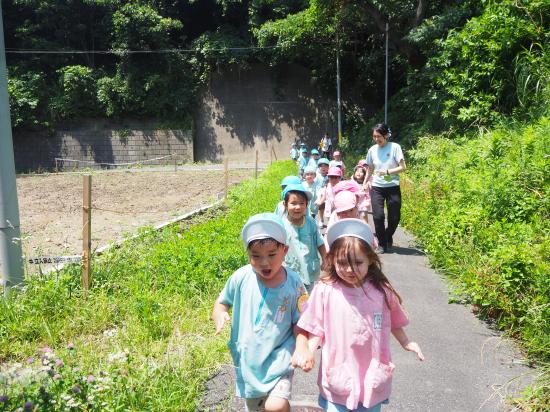 朝の身支度を整えたら、みんなではとぽっぽ体操をし、班の仲間と朝の散歩です。「どこに行こうか」仲間と行き先を相談し、早朝のお散歩を楽しみました。