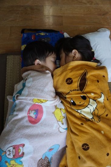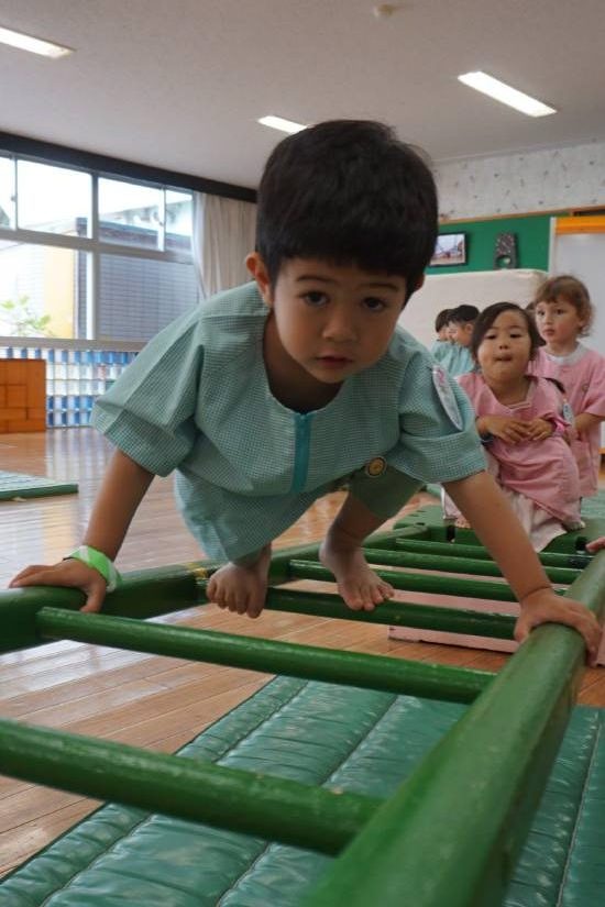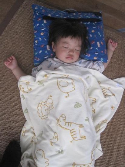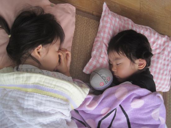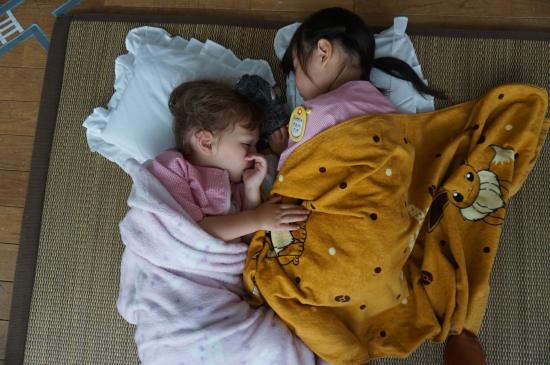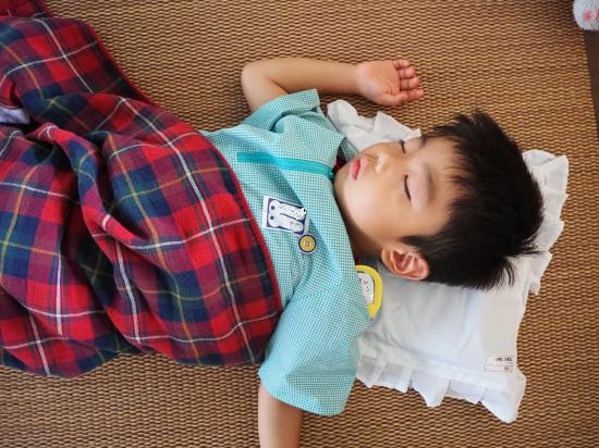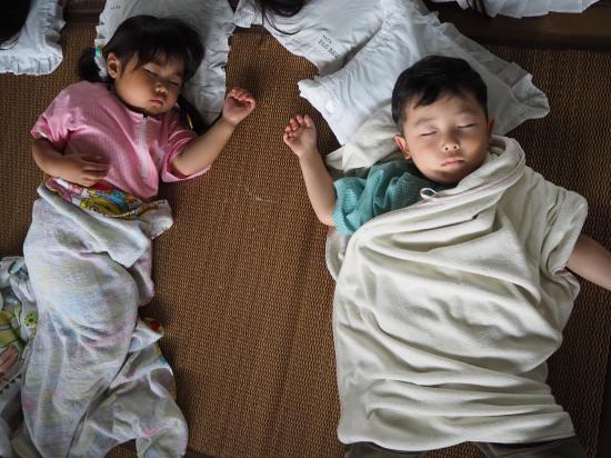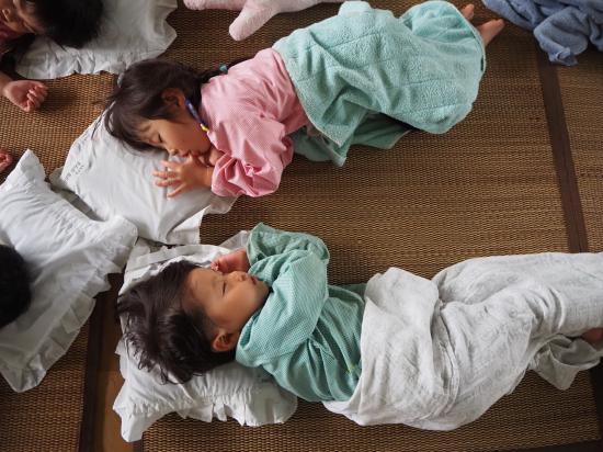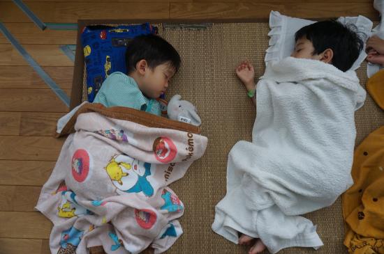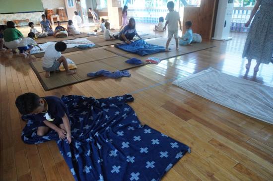合宿2日目の様子をお届けします。朝までぐっすりだった子ども達。園長先生と朝のご挨拶です。