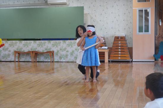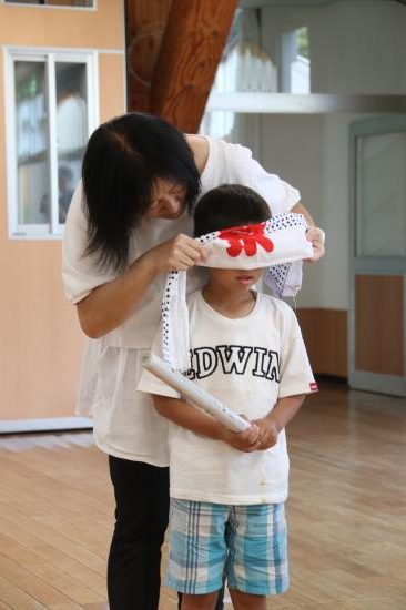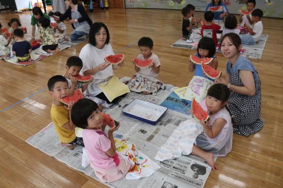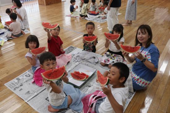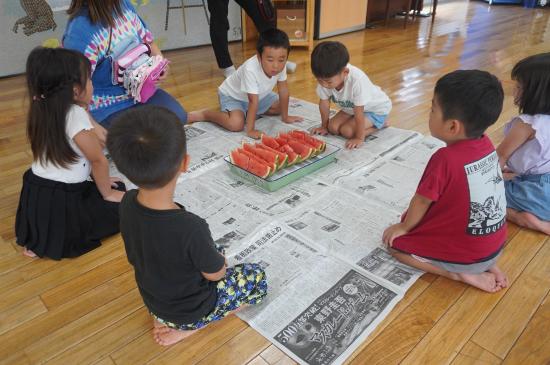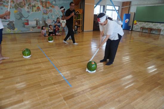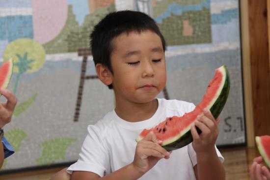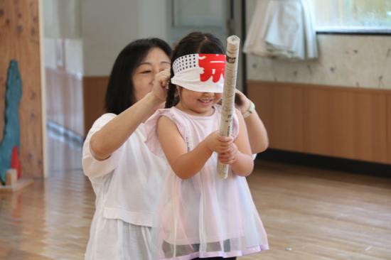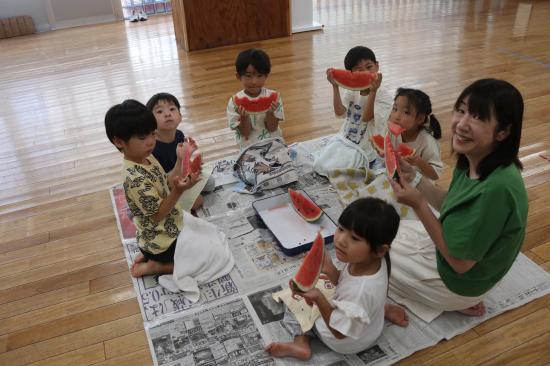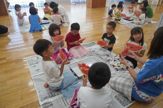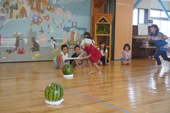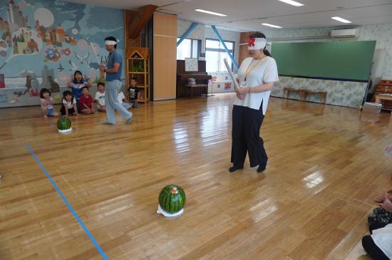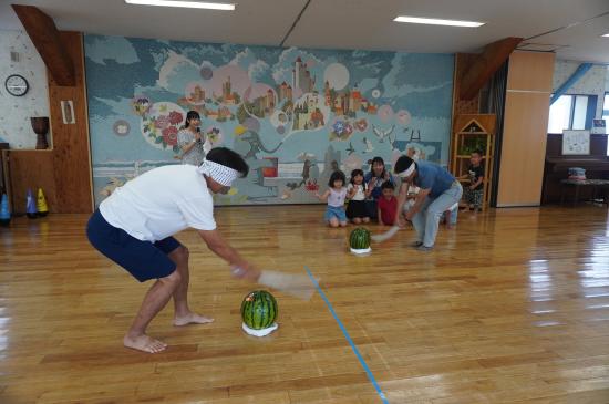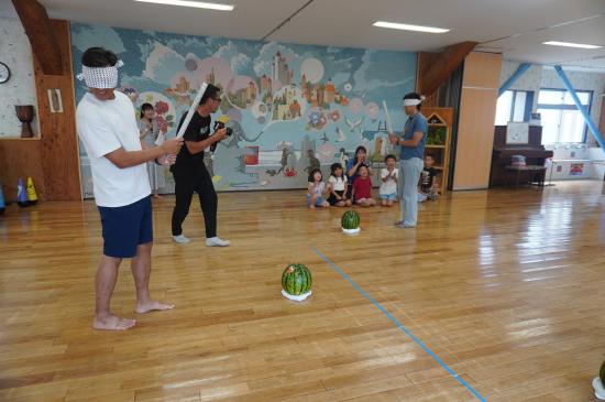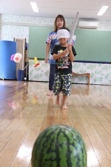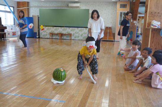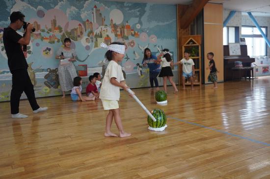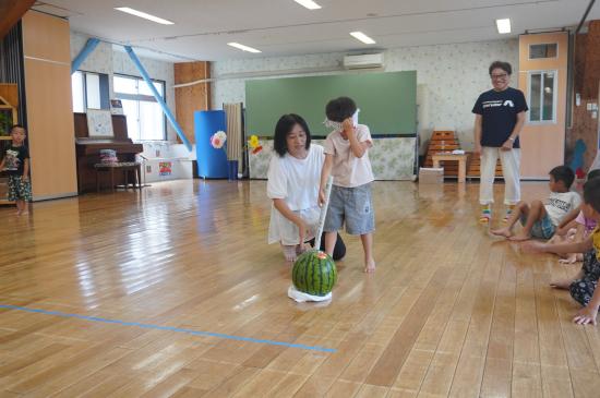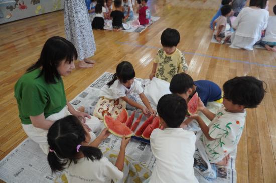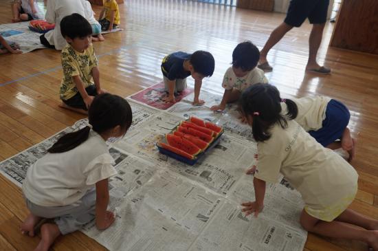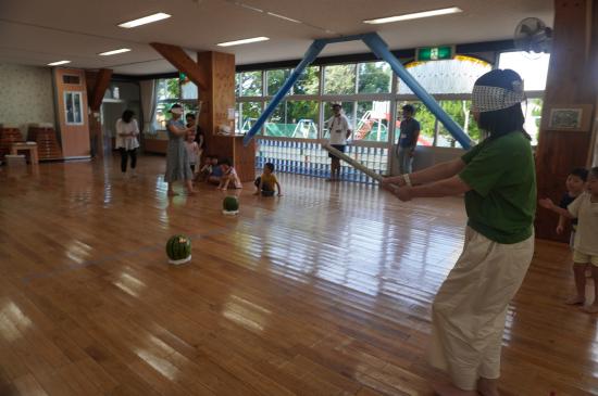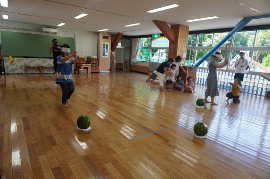 最後のプログラム『すいかわり』です。とっても楽しみにしていた子ども達でした。 目隠しをする前にすいかまでの距離を目測し、狙いを定めてスタートです。惜しかった子もいましたが、割れず…。班の先生、kamoサポさんの力を借りて割ることができました! その後、きれいに切ってもらい、美味しくいただきました。