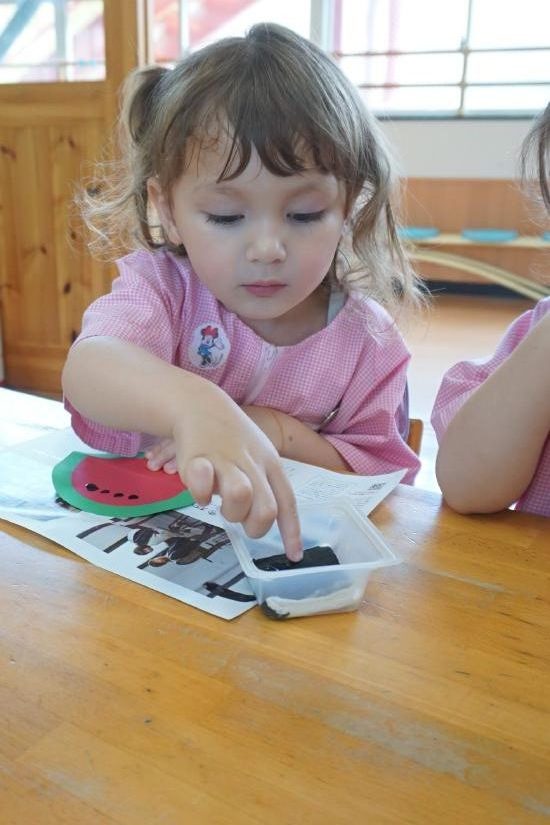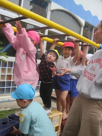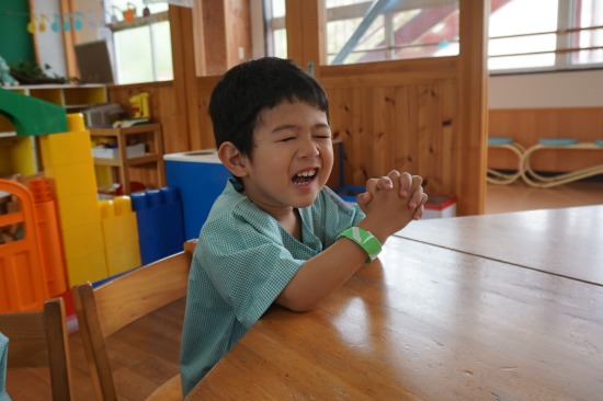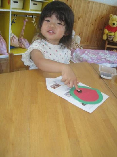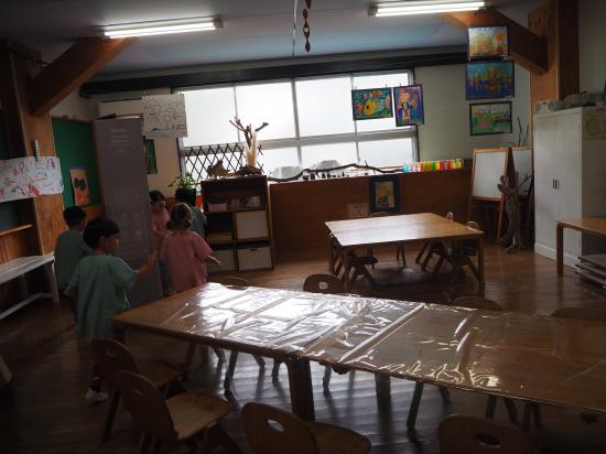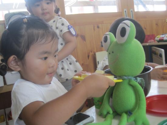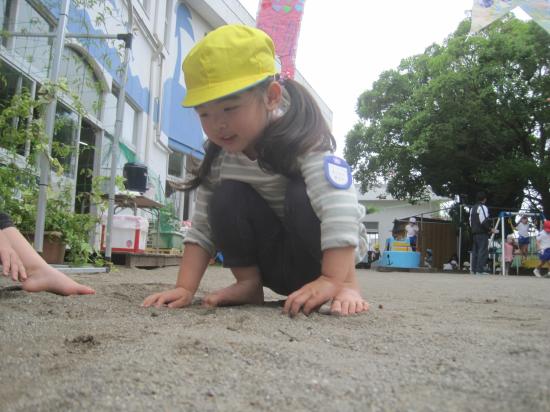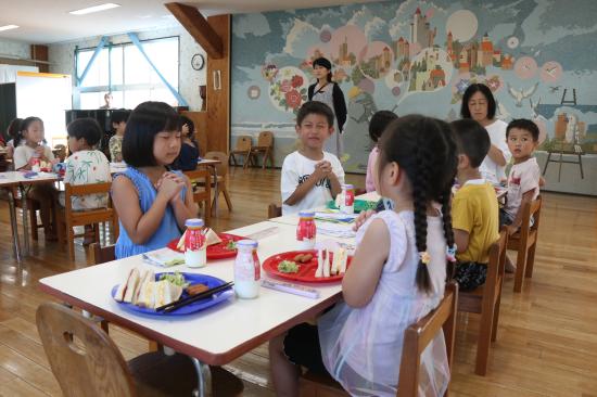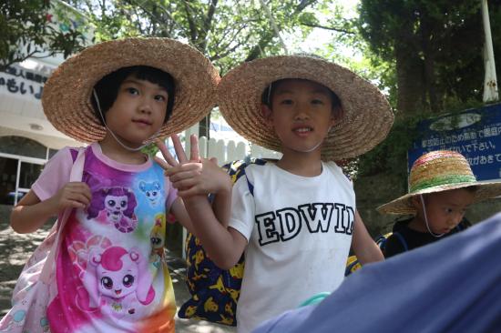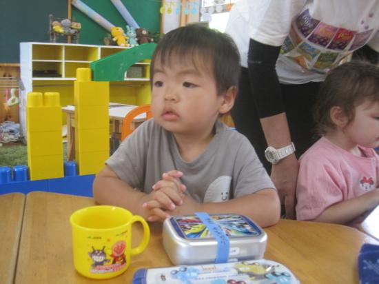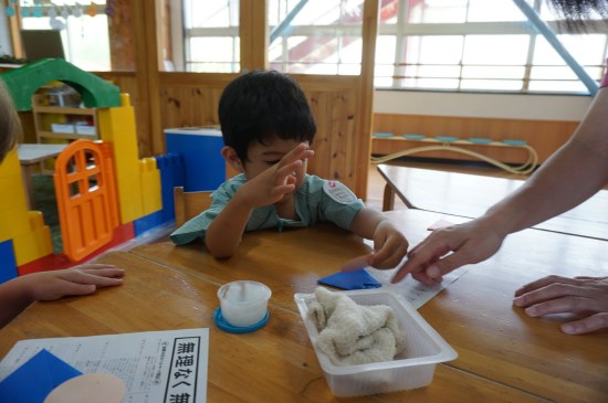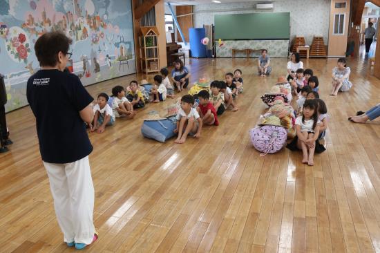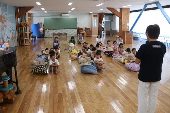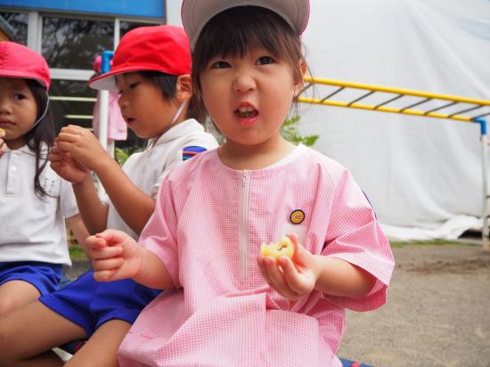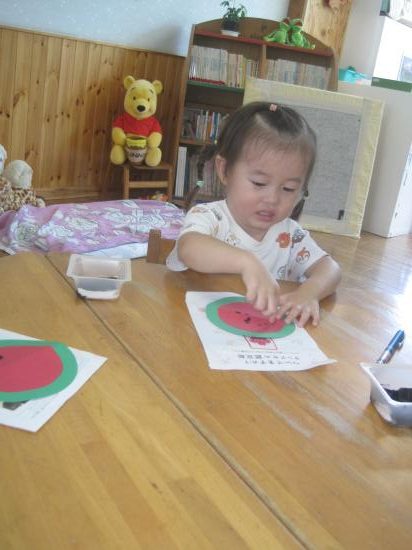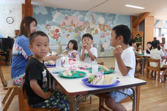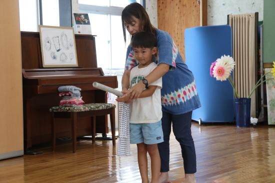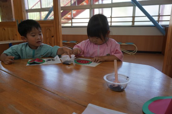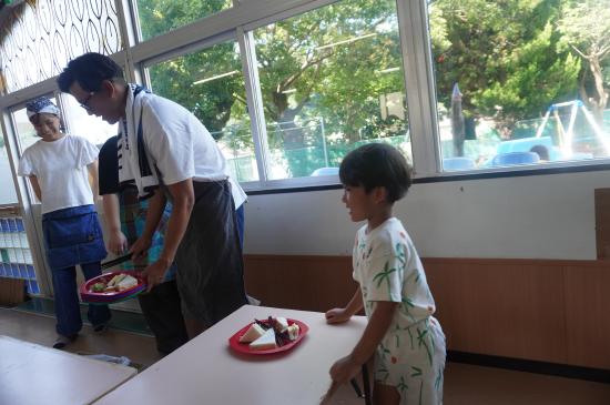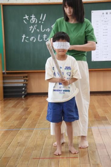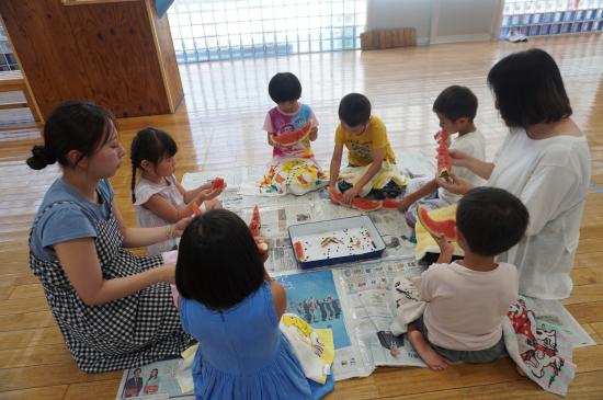 最後のプログラム『すいかわり』です。とっても楽しみにしていた子ども達でした。 目隠しをする前にすいかまでの距離を目測し、狙いを定めてスタートです。惜しかった子もいましたが、割れず…。班の先生、kamoサポさんの力を借りて割ることができました! その後、きれいに切ってもらい、美味しくいただきました。