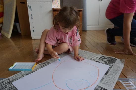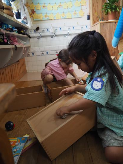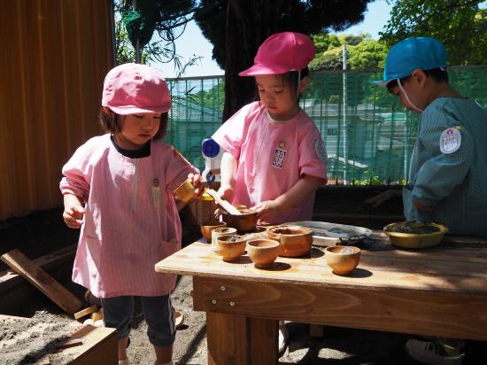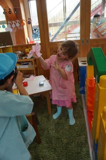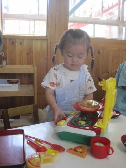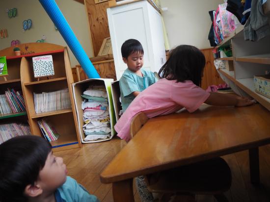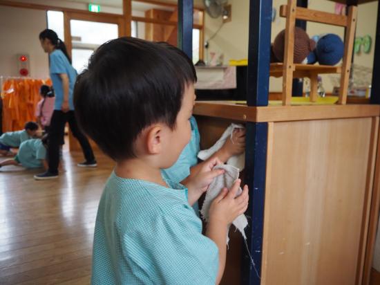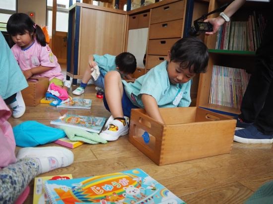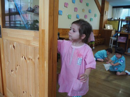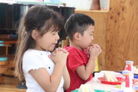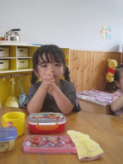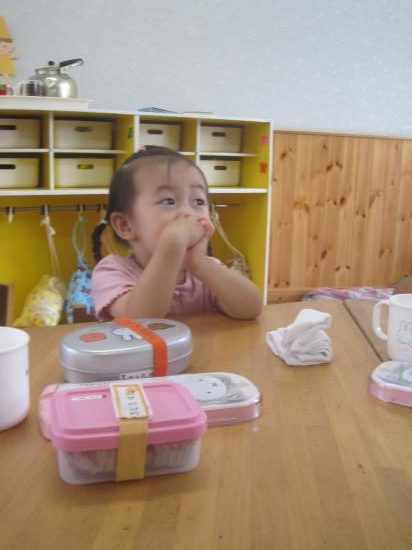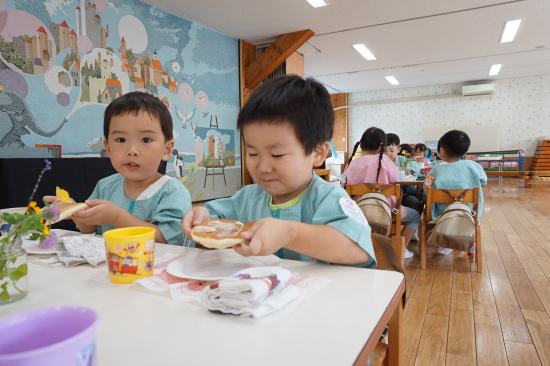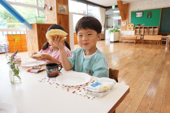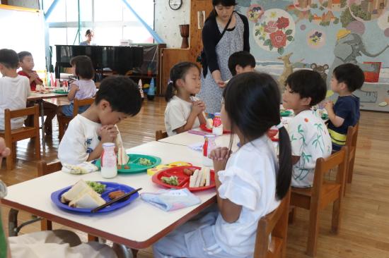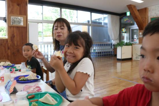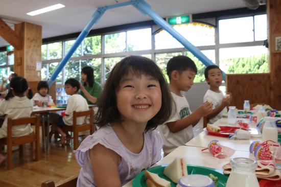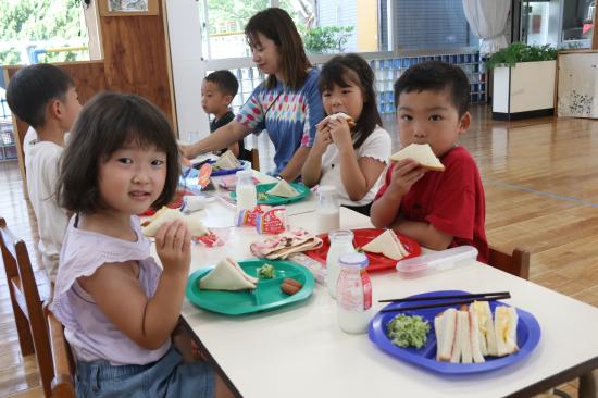 幼稚園に戻り、朝ごはんです。サンドウィッチをパクパク(*^-^*) 牛乳は1人一本を飲みます。牛乳が苦手だった子もこの日は一本飲んでいる姿もありました(*^-^*) 朝食後は、朝ごはんのお当番さんが片づけます。