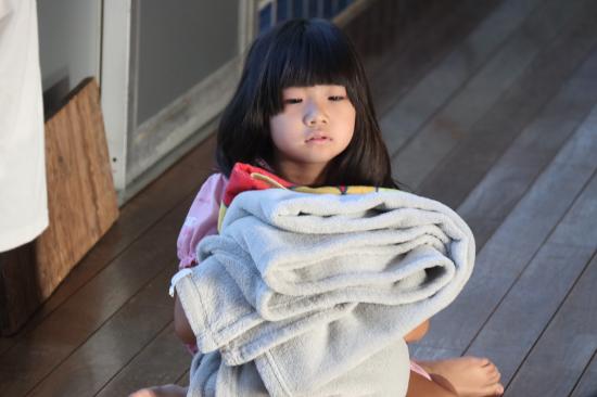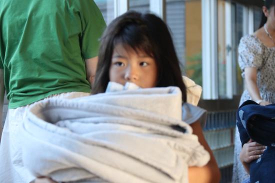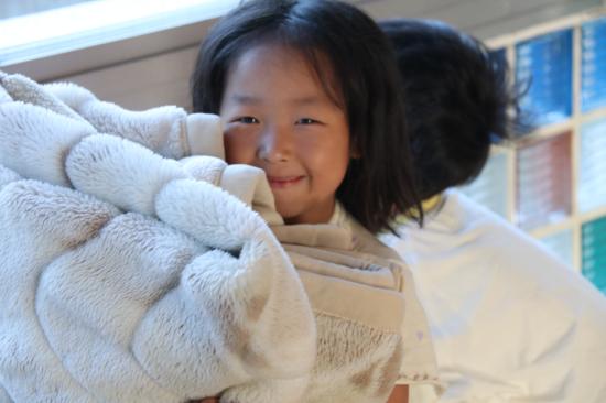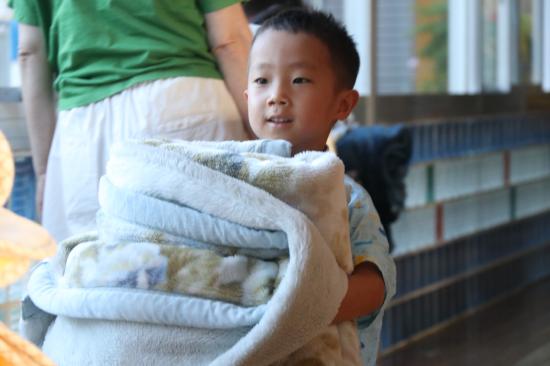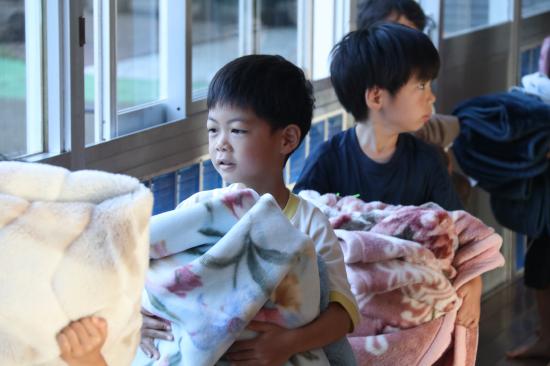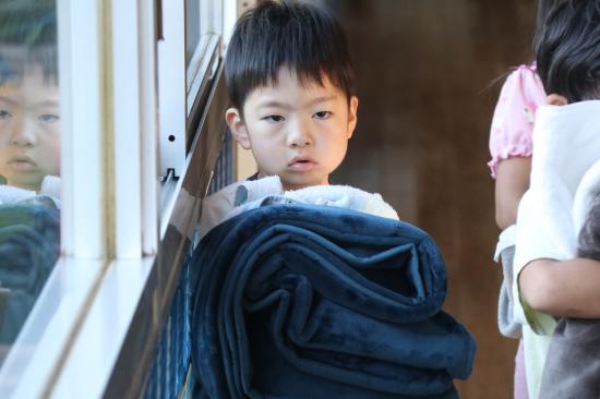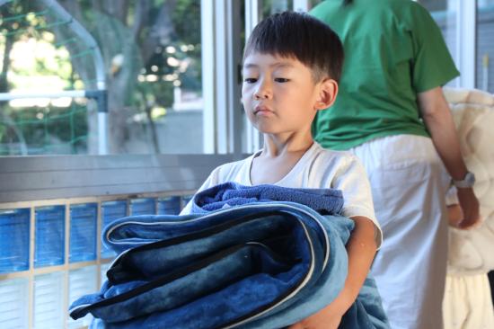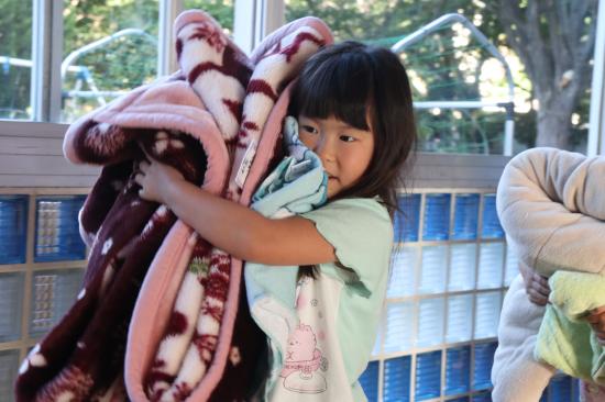 お布団の毛布を自分で畳みます。角と角を揃え、リュックに入れやすいように畳んでいきます。