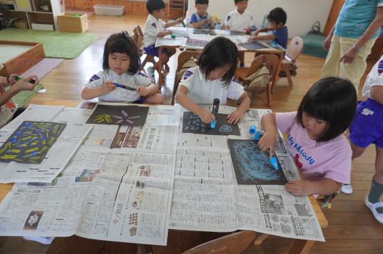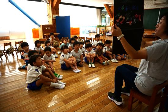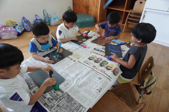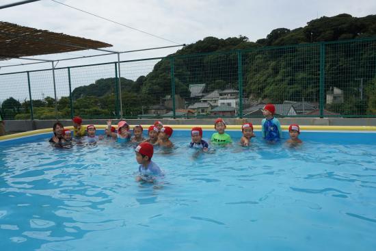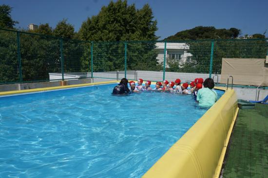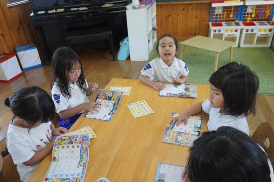 各クラス(コース)ともに登園するとコースごとのお部屋に集まり活動がスタートします。プール活動を中心にして外あそびや夏にちなんだ制作や絵本など…。