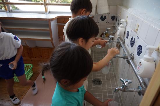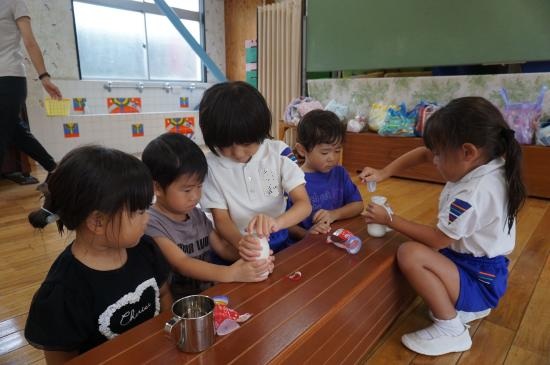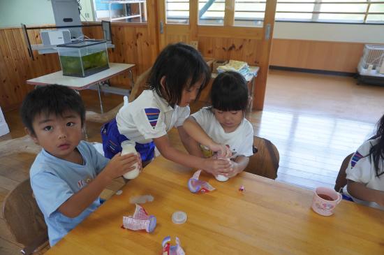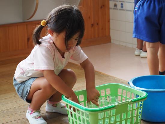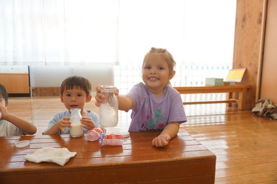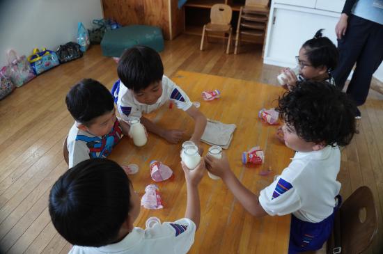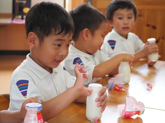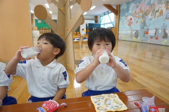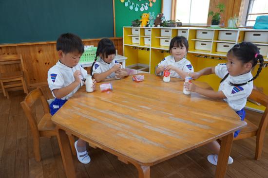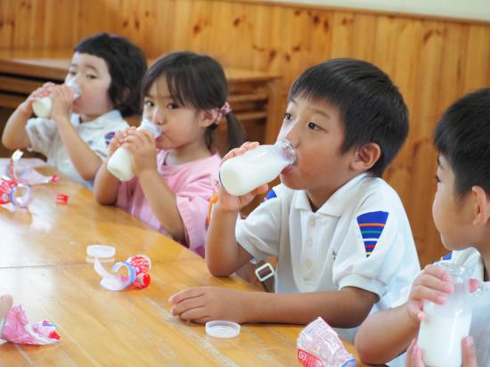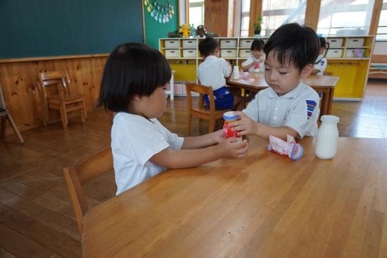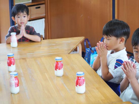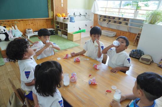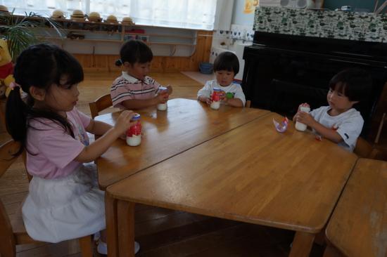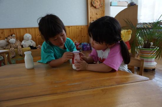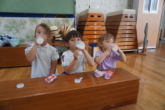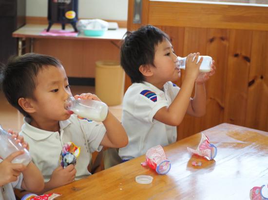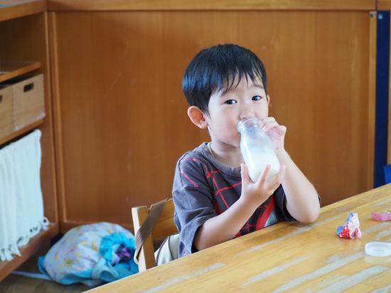 そして、おやつの牛乳をビンのまま飲むのも夏季保育ならではの光景ですね。