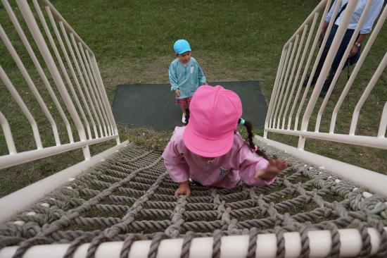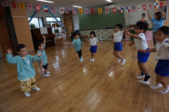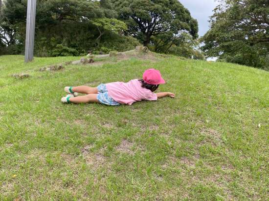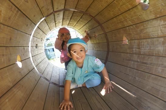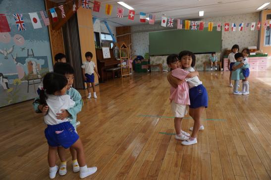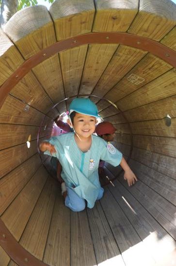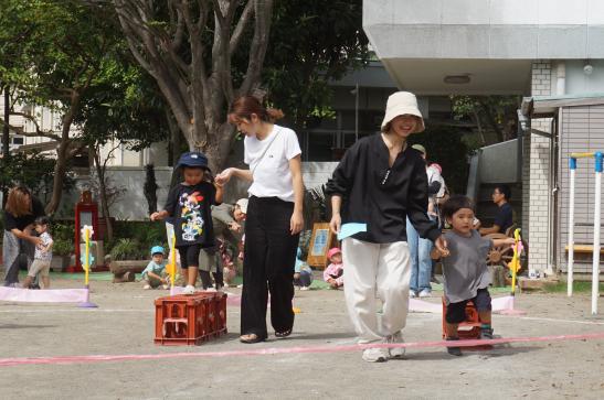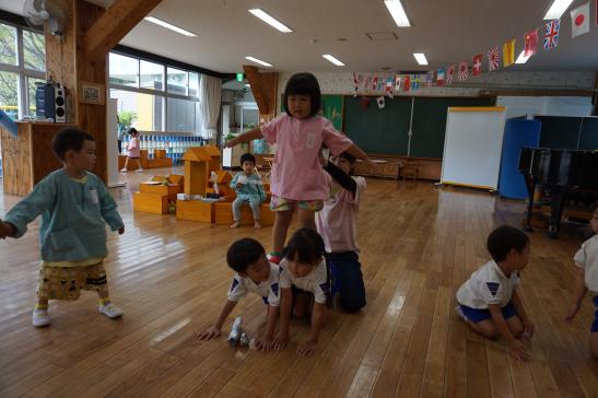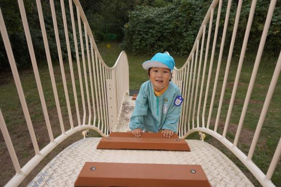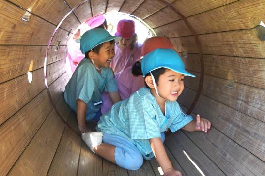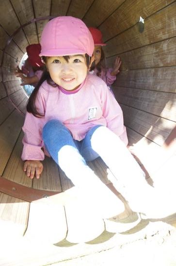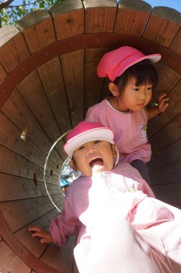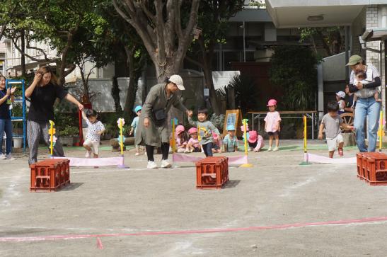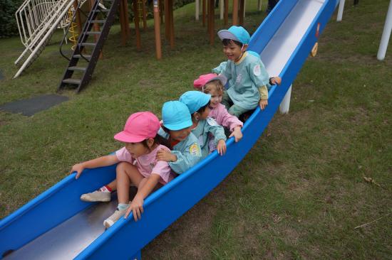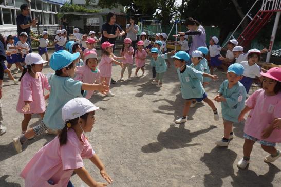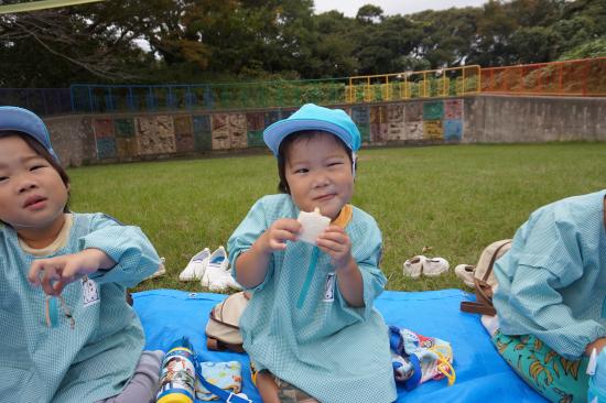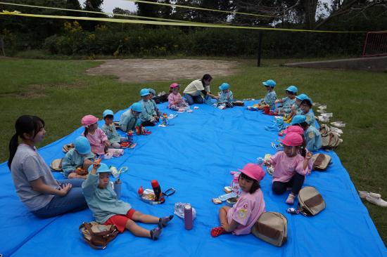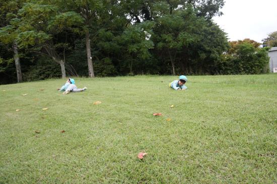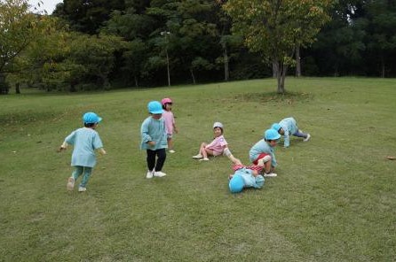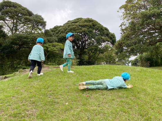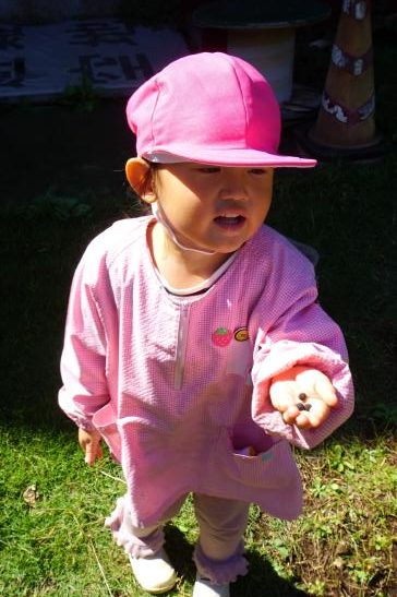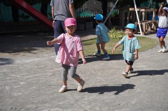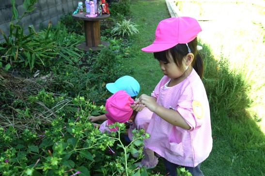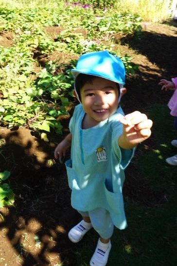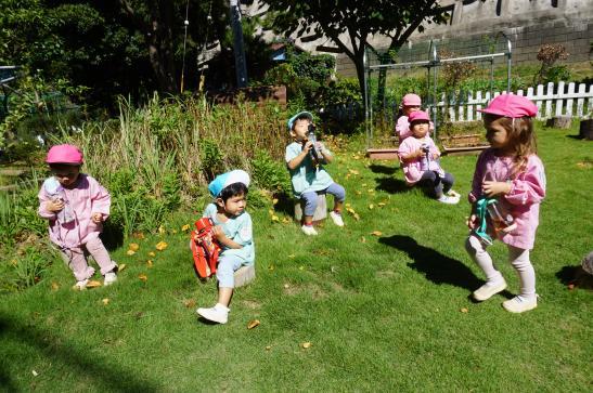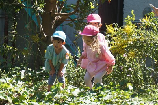 裏庭に着くと「これなに?」「なんかある!」と目がキラキラ。一番人気は『もこもこトンネル』でした。その後だんだんと裏庭いっぱいに活動場所を広げ、おしろい花のタネ探し、追いかけっこ、畑から少しだけ顔を出したおいもを発見!小さなちょうちょにも出会えて大興奮でした☺
