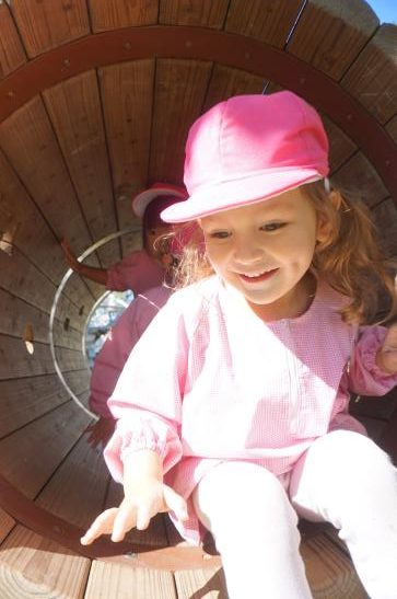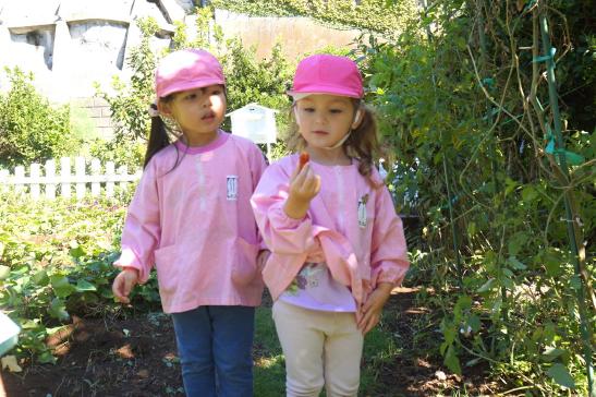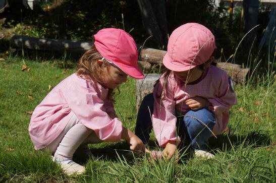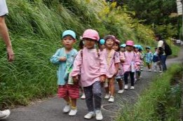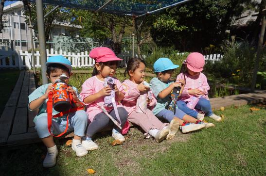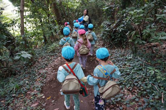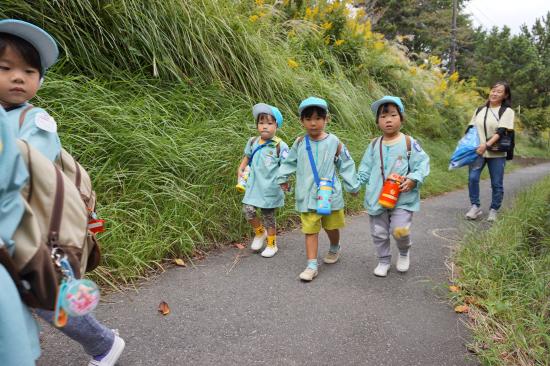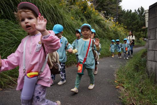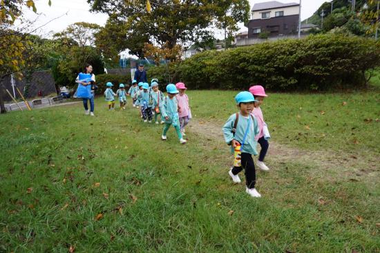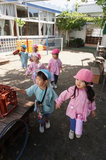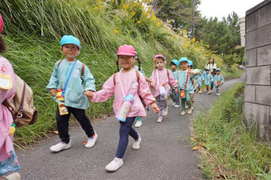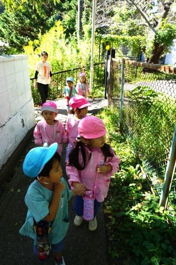 手をつないで「いってきま~す!」と元気に出発!水筒をかけてお出かけ気分が高まります♪「ここ、がっこう?」「はっぱ あるね」と裏庭へのほんのわずかな道のりも楽しそうなたんぽぽさんでした。