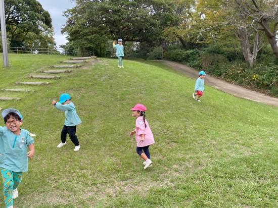 最後はきれいな落ち葉を見つけて、さくらんぼさんへのおみやげに…🍂澄んだ秋の空と風を体いっぱいに感じ、思い切り遊んだたたんぽぽさんでした。幼稚園に戻ると「また行きた~い!」の声☺またみんなで遊びに行きたいと思います。水筒のご協力ありがとうございました。次回の更新もお楽しみに♫(Instagramも合わせてお楽しみ下さい!)