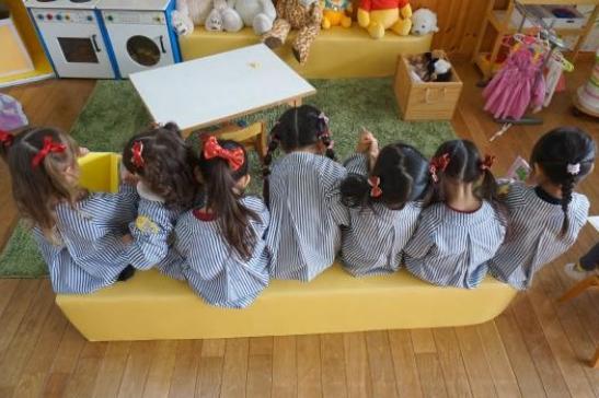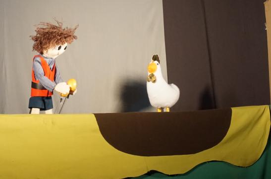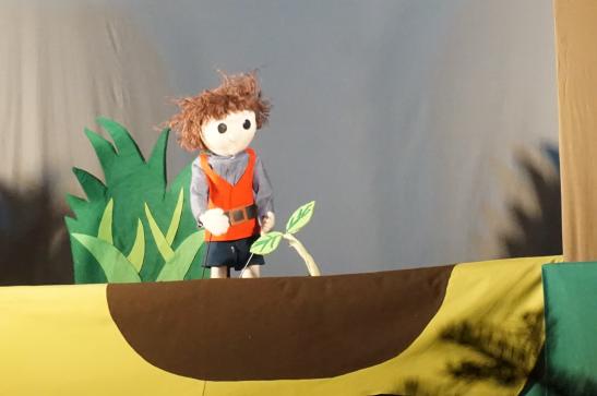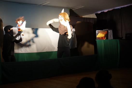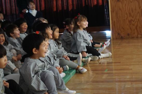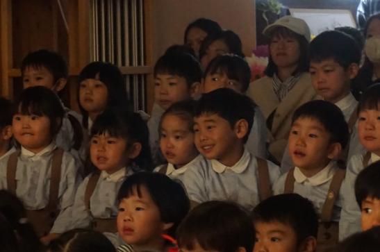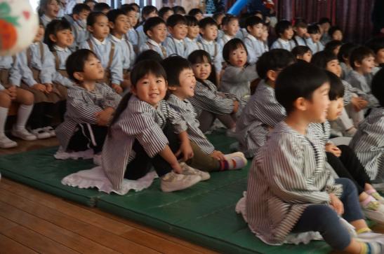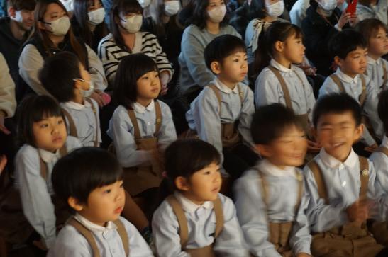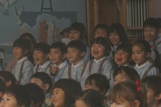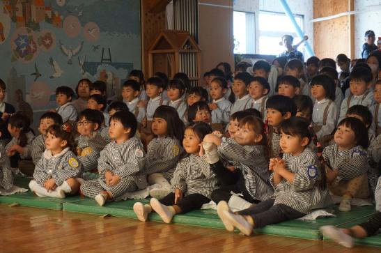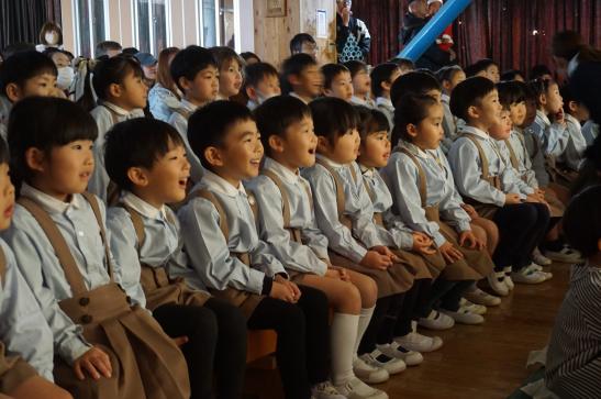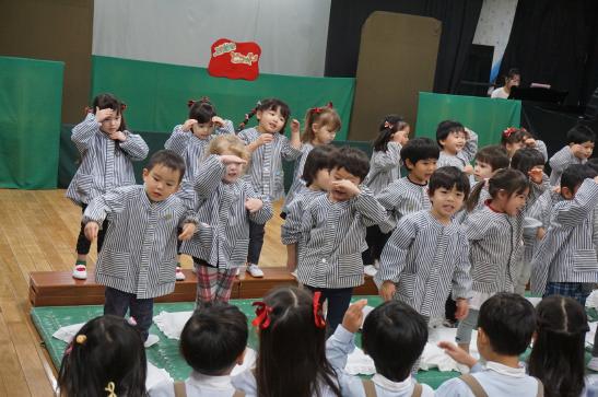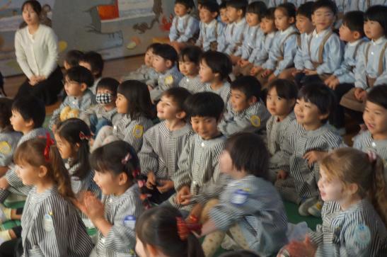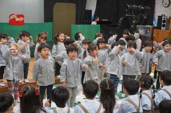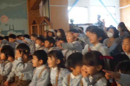 その後は人形劇団ピコットさんによる人形劇『ジャックと豆の木』を観ました。かもいようちえんでは子どもたちに多様な児童文化に触れてほしいと願い、学期ごとのお楽しみ会で様々なジャンルを鑑賞しています。ジャックとまめの木のお話は年長さんを中心に知っているお友だちも多くいました。笑いあり、ハラハラドキドキあり…。お話の世界に引き込まれる子ども達でした。