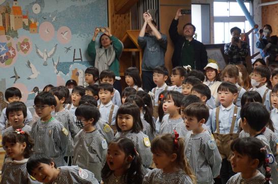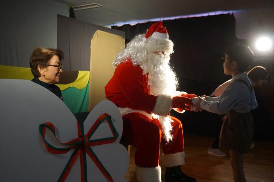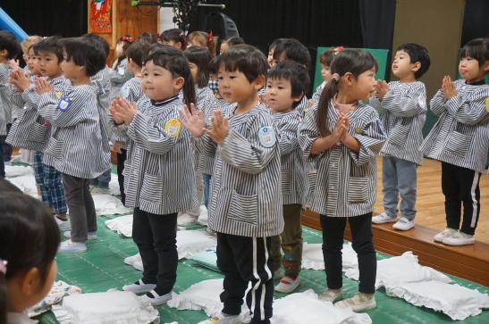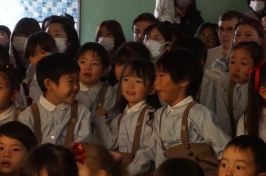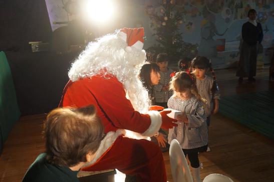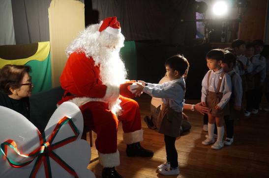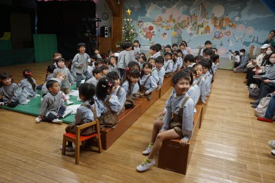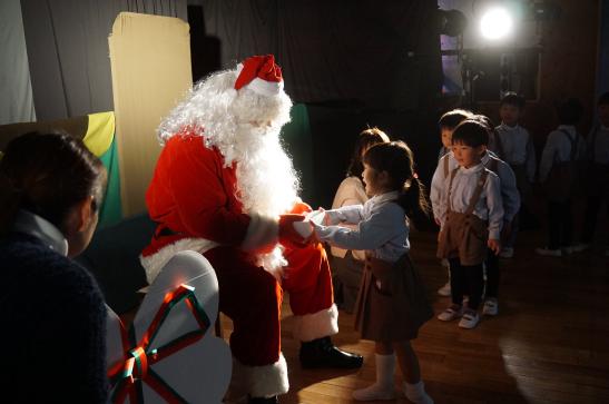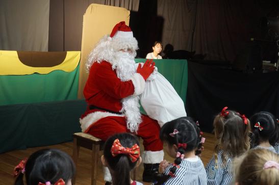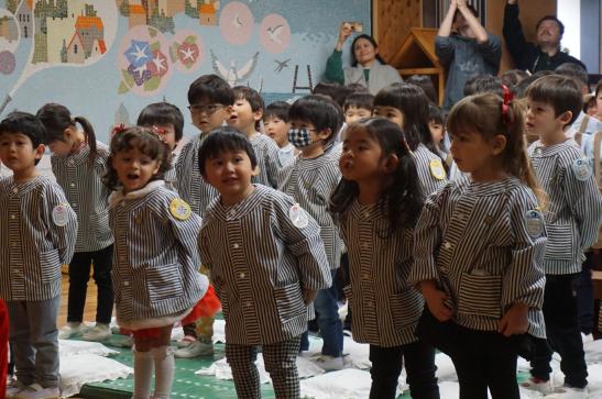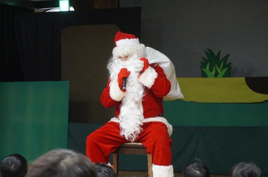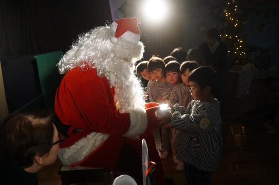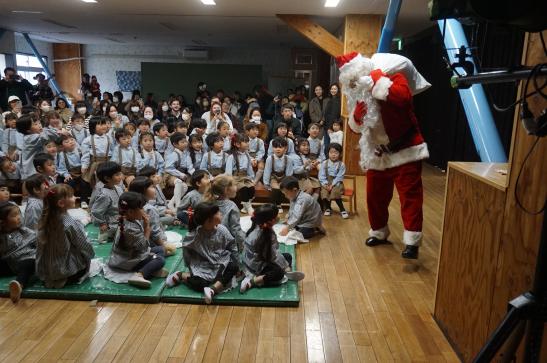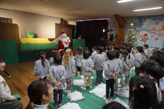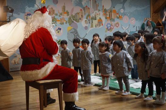 鈴の音が聞こえ、サンタクロースがかもいようちえんに来てくれました。「トナカイはどうして空を飛べるの?」「クリスマスじゃない時はサンタさんは何をしているの?」という子どもたちからの質問にやさしく答えてくれたサンタさんでしたね。「来てくれてありがとう!」の気持ちを込めて、子どもたちから『北の国から』の歌をプレゼントしました。