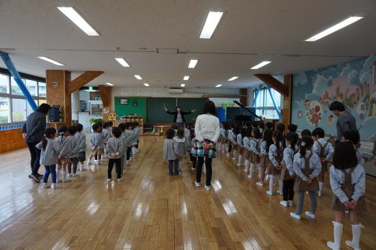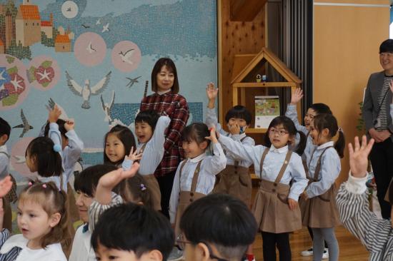みんなで『鴨居幼稚園の歌』を歌います。小さい学年のお友達もこの1年間でよく歌詞を覚え、元気に歌うことが出来ました。年中組さんはさすがの声量と歌声でした。年長さんになってもっと素敵な歌声に…。楽しみですね。
