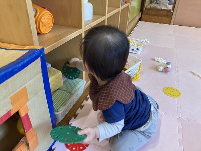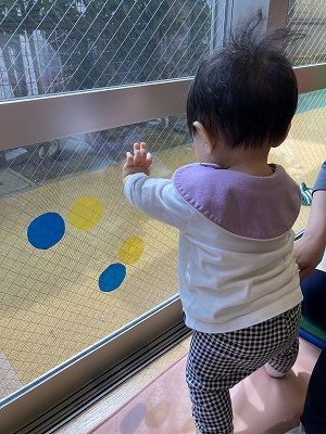 つきぐみの中でも月齢が違ったり一人ひとり違った発達段階の子どもたちがいて、ほとんどの色を知っている子、半分ぐらいの色を知っている子、色の名前がまだ分からない子、がいますが色に触れる機会をつくったことで色が分からなかった子どもも色に興味を持ち始めています。これからもさまざまな活動を通して色に気付いていけたらいいなと思っています。