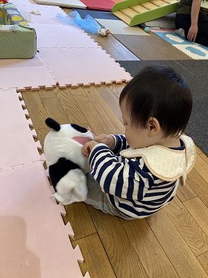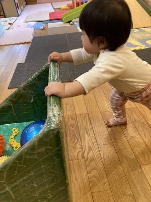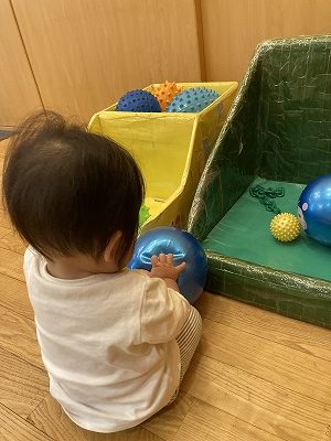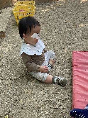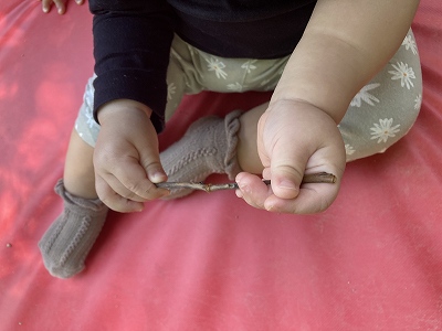 また自然物に興味を示し、砂、葉っぱなどに、手を伸ばし、触ってみて、感触を楽しんでいます。砂はサラサラとした感触が楽しく手で触って、手から落ちるのを見て楽しんでいます。石にも興味津々。宝物ように握りしめ持ち歩いている姿はとても微笑ましいです。