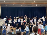 竹太鼓を音楽に合わせてできるようになったころ…「踊りも入れてみない?」と子どもたちに提案してみると、「いいねいいね」と一緒に振り付けを考えていきました。音楽をかけると自由に表現し始める子どもたち。「こんなんはどう?」「手を横にしてこうやって…」「かまきりのポーズ!」「恥ずかしいよ~」「去年のそらぐみさんは2人でやってたよ」とアイデアがたくさん出てきます。「かまきりのポーズ!」は恥ずかしい意見もあったので、「最後の決めポーズで自由にしたらいいよ」と伝えましたが、結局は全員がかっこよく「やー!!」とポーズをするのに自然となっていきました。