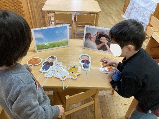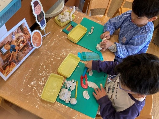 その後ペープサートで物語を表現したり、粘土でまんまるぱんを作ったり表現遊びへ繋がりました。