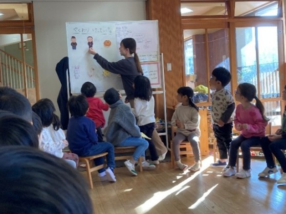そして“お話のまんまるぱんが逃げるところが面白い”“食べられずにお話が続いてほしい”という子どもたちの思いを劇あそびに取り入れ、子どもたちから出てきた言葉をセリフにしながら、ほしぐみオリジナルのお話の完成。