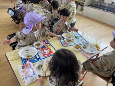 先日はあいにくの雨でデイキャンプが中止になってしまいましたが、年長さんたちはがっかりするどころか、園でとっても楽しい“特別デイキャンプ”を行いました!