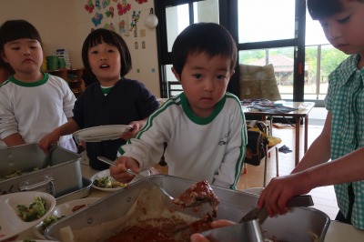 見事材料をゲットした子どもたちは、洗ったり、皮をむいたり、ちぎったり、たくさんの作業をしてみんな満足!