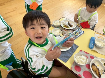 “こどもの日”に因んだ給食メニューの日でした。こいのぼりハンバーグを目の前に子ども達は大喜び!