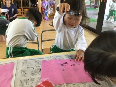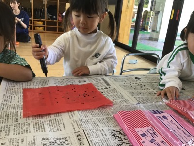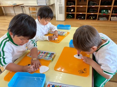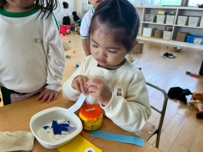 “いちごのつぶつぶ~”と言いながらお部屋に飾るイチゴを製作しています。