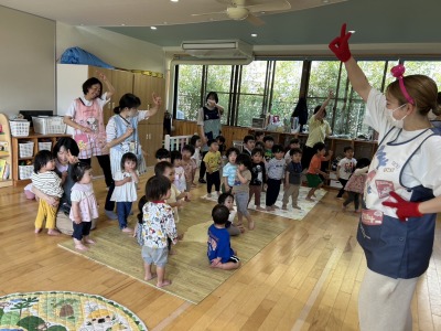 エビとカニに変身した先生たちにはじめは驚いている姿もありましたが、最後にはみんなダンスを踊っていました♪ゆりかごさんのお友だちもリズムにのっていました!