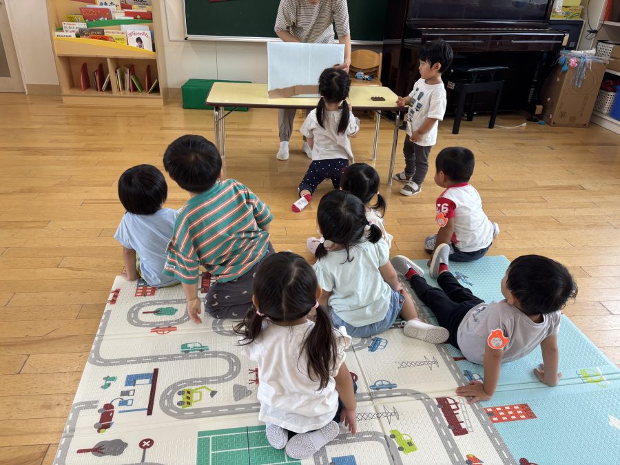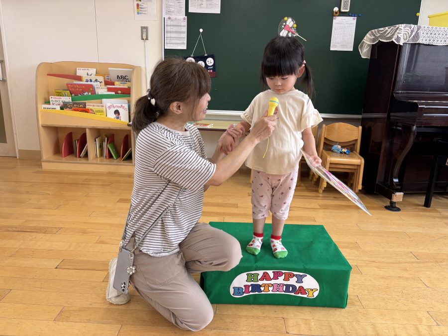 恒例のインタビューTimeでは「まぁるいものがだ~い好き♡」と教えてくれました。ぶどうかな~おにぎりかな~クラスのお友だちとワクワクしながら一緒に考えて楽しみました。