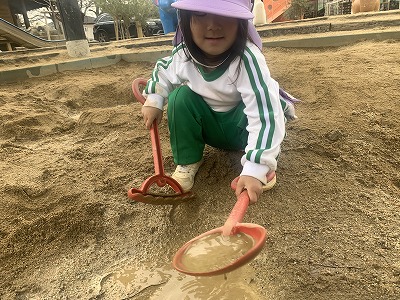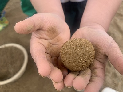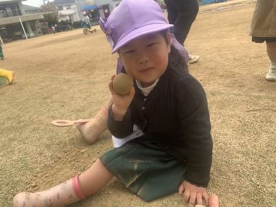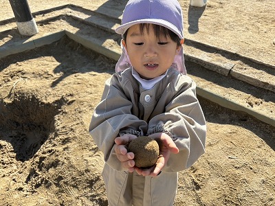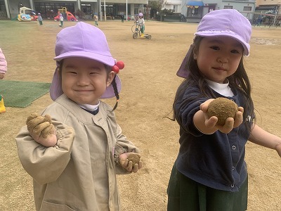 手のひらいっぱいの大きなどろ団子や、小さくてかわいらしいどろ団子が次々に完成し、「わたしのをみて!」「まるくなってきたよ!」と、嬉しそうに見せ合う姿が見られました。