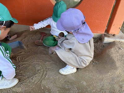園庭の隅で、子ども達が集まって何やら楽しそうに遊んでいました。