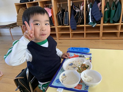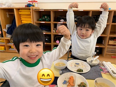 元気もりもりポーズをしながら、にこにこ笑顔で給食の時間を楽しんでいました。