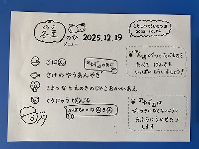 冬至の給食で心も身体もぽかぽかに。寒い冬も元気に過ごしていきたいですね!