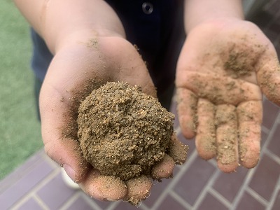 まずは園庭のどろの土をスコップですくい、手のひらでぎゅっぎゅっと丸めます。
