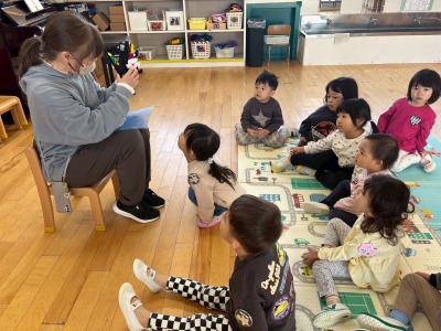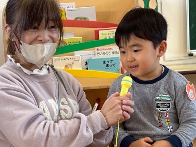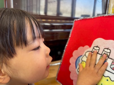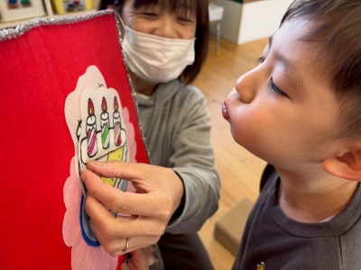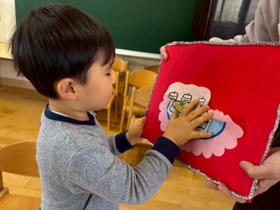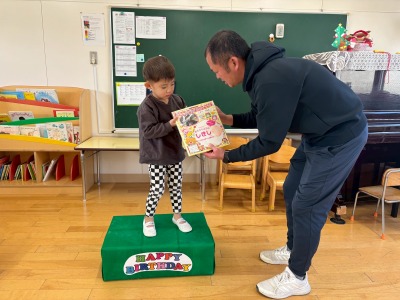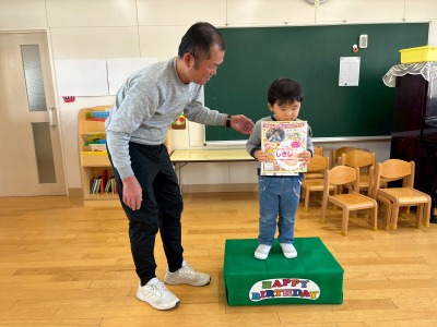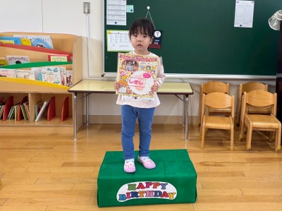 少し緊張していたお友だちでしたが、お誕生会のグリーンの台にひとりで立ち、副園長先生からプレゼントをしっかりといただくことができました。
