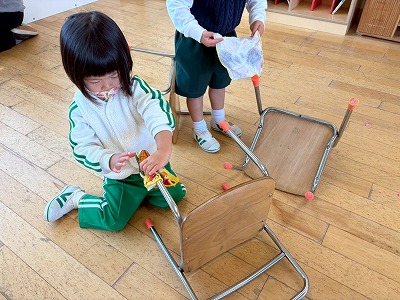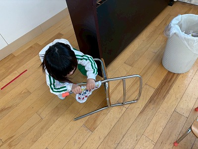 イス拭きでは、イスの座面だけでなく足の裏まで丁寧に拭く姿が見られました。