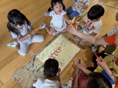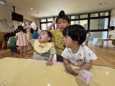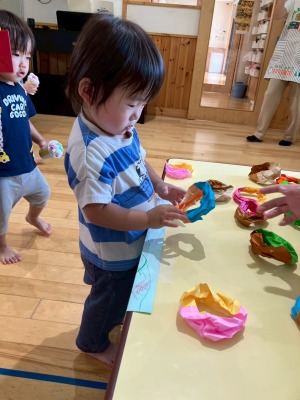 お買い物ごっこ当日、ゆりかごぐみとばぎーぐみも遊びにきてお買い物を楽しんでいました。「いらっしゃいませー!」「買ってくださーい」と大きな声で呼び込みをしたり、お金をもらって商品を渡したりしました。