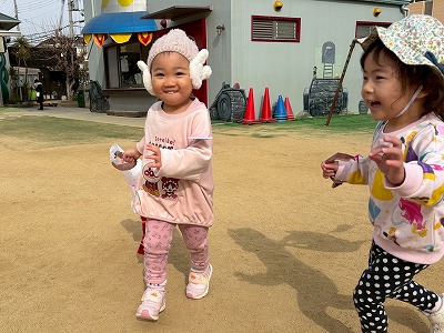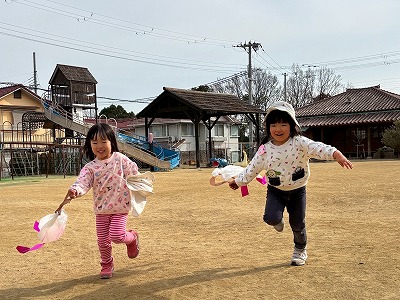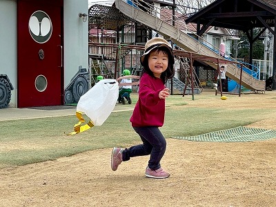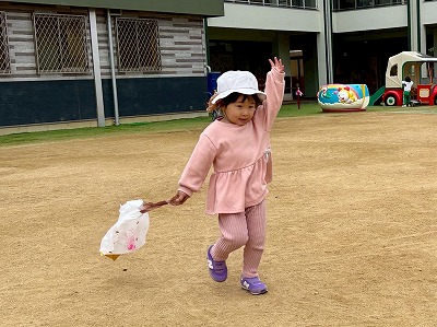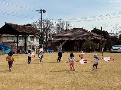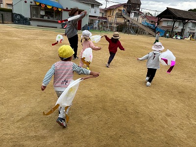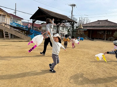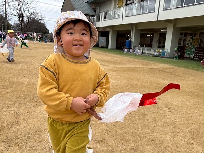 広い園庭では、凧を持って元気いっぱいに走り回り、「わぁー!」と歓声をあげながら、ニコニコ笑顔があふれていました。