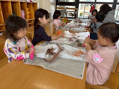 自分たちで凧の尾っぽを切り、のりでぺったん♪ マジックでグルグルと、思い思いにお絵描きをしました。